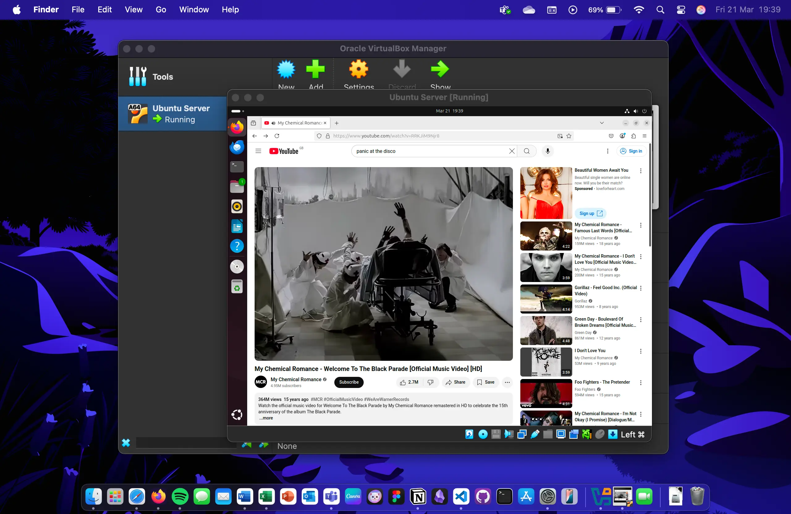 My first goal was to get everything running on my MacBook using Ubuntu. VirtualBox installed without any issues, and I set it up in Expert Mode based on what I had learned in college. I downloaded an Ubuntu Server ISO image and loaded it into VirtualBox. However, it opened into the UEFI console. I began troubleshooting—first by searching online for fixes, and then by asking ChatGPT for help. Eventually, I realized I had downloaded the wrong image for my host machine's architecture. After installing the correct version, I created a user account and installed Guest Additions to enable internet access, which I tested by watching My Chemical Romance music videos on YouTube.